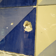 A remoção das grossas películas de repintura revelou nuances cromáticas elaboradas, onde a máscara de molde vazado da estampa recebe colorações diferentes ao longo dos três planos horizontais de cor que compõem o imitativo.