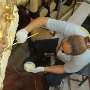 Nos 42 balcões foi realizada extensa consolidação sobre os adornos em gesso, que foram finalizados por amplos retoques cromáticos e de douramento.